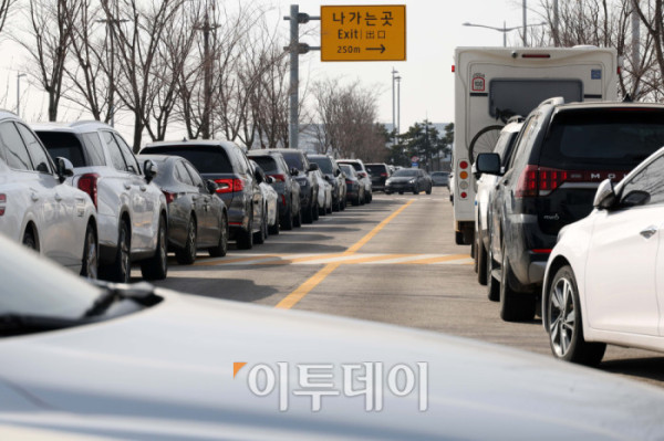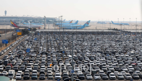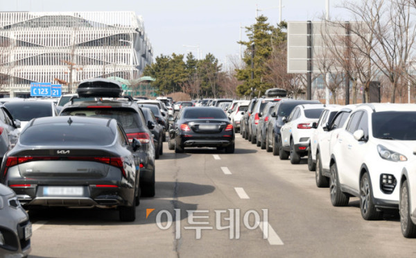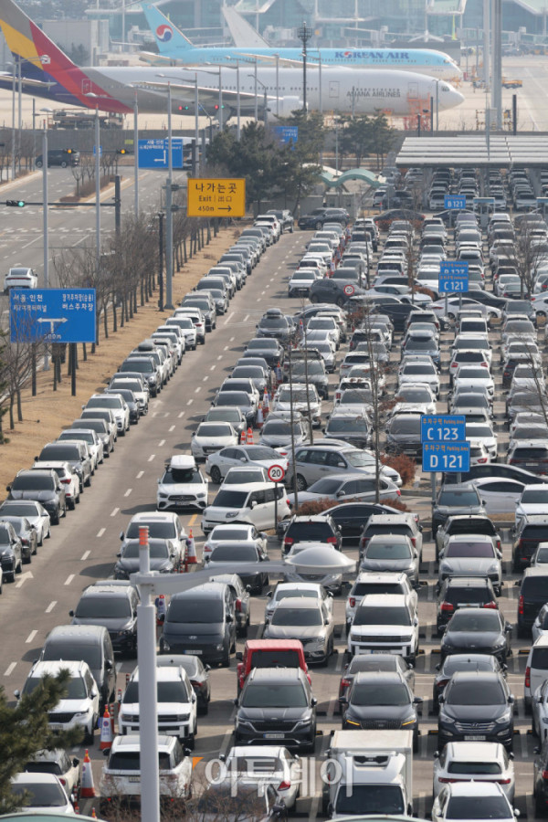 ▲30일 서울 인천국제공항 제2여객터미널 장기주차장이 혼잡한 모습을 보이고 있다. 아시아나항공이 제2여객터미널에서 운항을 시작하면서 이용객이 늘어나 주차장과 진입로 일대에 차량 정체가 이어지고 있다. 고이란 기자 photoeran@
