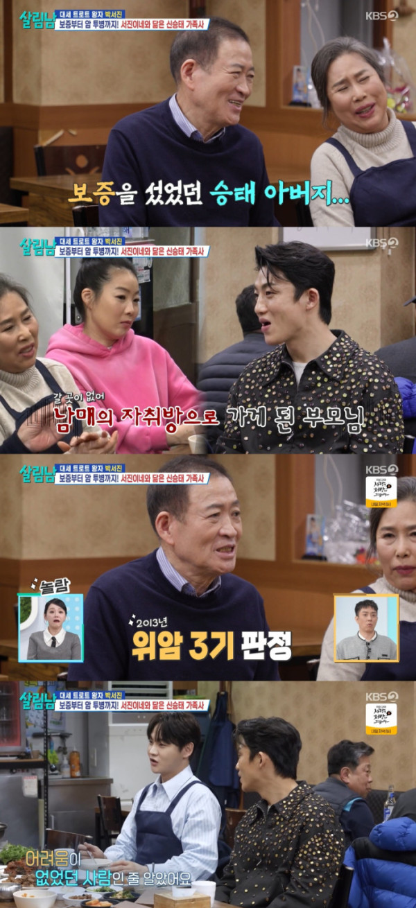 이날 신승태의 부모님은 “서진이 가족을 보니 우리랑 닮은 점이 많더라”라며 아버지의 보증과 암 투병 등에 대해 털어놨다.