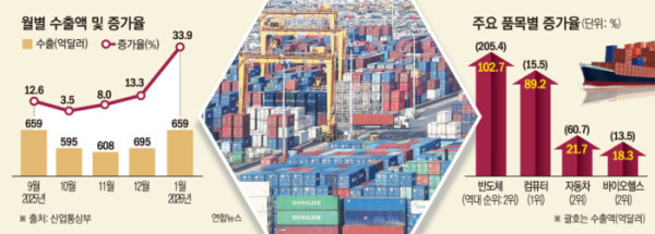 김정관 산업부 장관은 "올해 1월 수출이 두 자릿수의 높은 증가율을 기록하며 순조로운 출발을 보였다"며 "특히 반도체·자동차를 비롯한 주력 품목과 소비재 등 유망 품목이 고르게 성장세를 보인 점이 긍정적"이라고 평가했다.