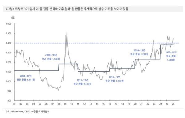 박상현 iM증권 이코노미스트는 2일 보고서를 내고 “미국의 자국우선주의 강화와 디지털 경제·인공지능(AI) 주도권 확대로 미국 예외주의가 재부각되고, 중국의 디플레이션 리스크가 더해지며 달러화의 추세적 강세가 촉발되고 있다”며 “달러 강세 압력이 높아지고 원화를 비롯한 주요국 통화는 약세 기조를 보일 수밖에 없는 경제 구조”라고 이같이 밝혔다.