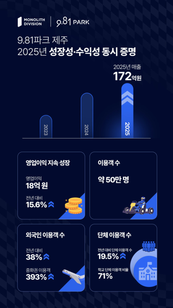 특히 이용객의 도전 욕구를 자극하는 ‘라이선스 제도’가 재방문을 이끄는 핵심 동력이 됐다. 최고 등급인 ‘마스터’ 라이선스 보유자 중 최다 주행자는 작년 한해 동안 9.81파크 제주를 19차례 방문해 누적 225회 레이싱을 기록했다. 신규 고객 확대와 충성 고객의 재방문이 이어지며 이용객 수는 전년보다 약 1만 명이 증가했다.
