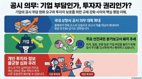 글로벌 주요국이 상장사 공시 부담 완화 움직임을 보이는 가운데 한국은 반대로 규제가 강화되고 있어 기업 부담 해소와 투자자 보호를 두고 논란이 되고 있다.