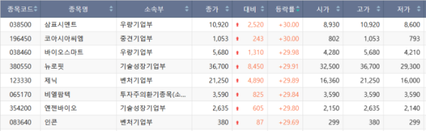 코스닥 시장에서는 삼표시멘트, 코아시아씨엠, 바이오스마트, 뉴로핏, 제닉, 비엘팜텍, 엔젠바이오, 인톤 등이 상한가 대열에 합류했다.