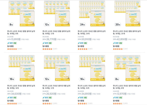 2일 쿠팡 판매 페이지를 보면 쿠팡 자체 상표(PB) 자회사 씨피엘비(CPLB)의 루나미 생리대 제품 중 ‘루나미 소프트 중형 18개입’ 8~24팩 제품이 가격 인하 이틀 만에 일시 품절 상태로 나타났다. ‘루나미 소프트 대형 16개입’ 역시 8~24팩 모두 마찬가지다.