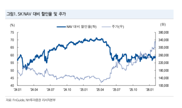 NH투자증권은 SK의 목표주가를 40만5000원으로 23% 올렸다. SK스퀘어·SK텔레콤 등 핵심 자산 가치가 커졌는데도 주가는 순자산가치(NAV)보다 약 60% 낮아, 자산 재평가와 자사주 소각 기대를 함께 반영할 시점이라는 판단이다.