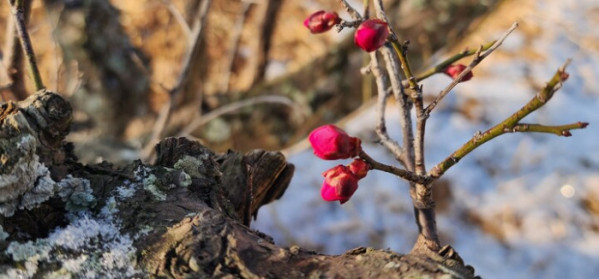 입춘을 하루 앞두고 밤사이 눈이 내린 가운데 전남도 광양시청 앞 미관광장 매화동산에서 홍매가 개화했다.