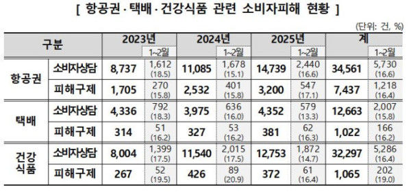 최근 3년간(2023~2025년) 설 연휴를 전후한 1~2월에 소비자원에 접수된 피해구제 사건은 항공권 1218건, 택배 166건, 건강식품 202건으로, 전체의 16.4%(항공권), 16.2%(택배), 19.0%(건강식품)를 차지하는 것으로 나타났다.