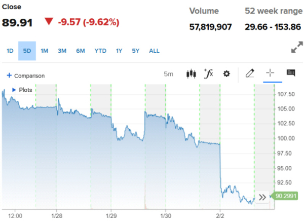 온라인 주식거래소 로빈후드는 전 거래일 대비 9.62% 하락한 89.91달러(약 13만 원)에 마감했다. 비트코인 약세가 영향을 미쳤다.
