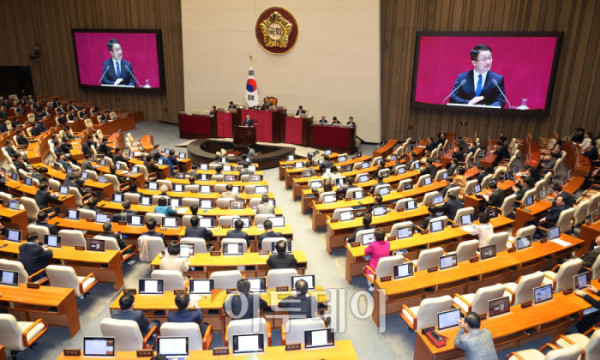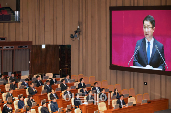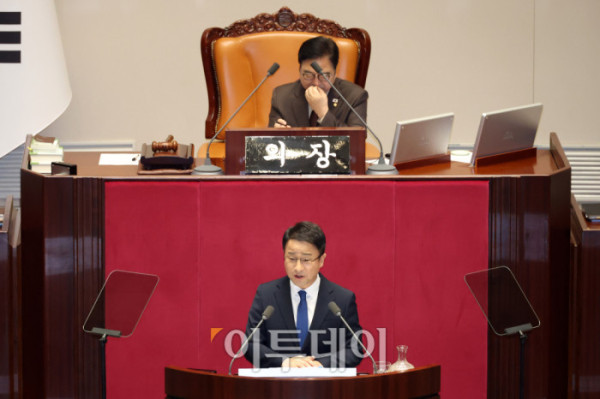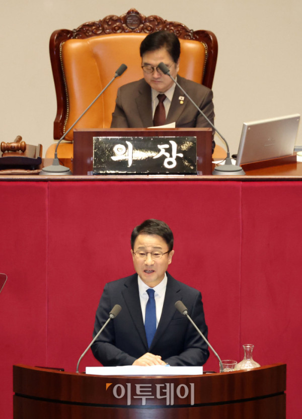 ▲한병도 더불어민주당 원내대표가 3일 서울 여의도 국회에서 열린 본회의에서 교섭단체 대표연설을 하고 있다. 고이란 기자 photoeran@