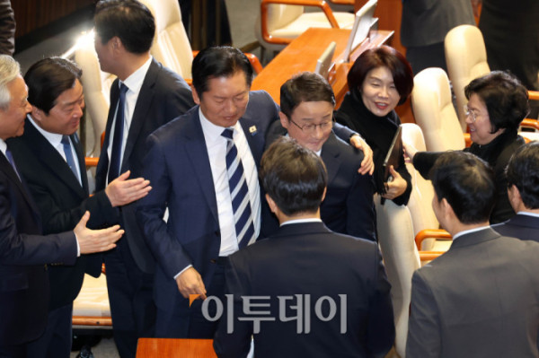 ▲한병도 더불어민주당 원내대표가 3일 서울 여의도 국회에서 열린 본회의에서 교섭단체 대표연설을 마치고 정청래 당대표의 격려를 받고 있다. 고이란 기자 photoeran@
