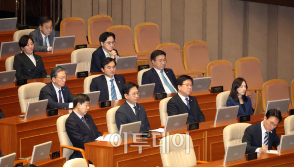 ▲3일 서울 여의도 국회에서 열린 본회의에서 김민석 국무총리를 비롯한 국무위원들이 한병도 더불어민주당 원내대표의 교섭단체 대표연설을 경청하고 있다. 고이란 기자 photoeran@