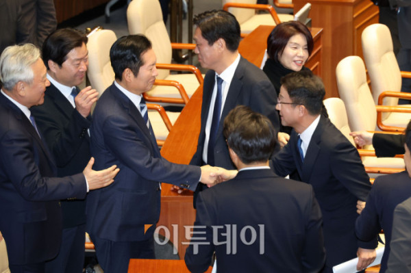 ▲한병도 더불어민주당 원내대표가 3일 서울 여의도 국회에서 열린 본회의에서 교섭단체 대표연설을 마치고 의원들과 인사하고 있다. 고이란 기자 photoeran@