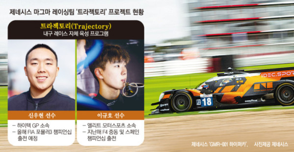 2일 완성차 업계에 따르면 제네시스는 마그마 레이싱 자체 인재 육성 프로그램 ‘트라젝토리(Trajectory)’에 신우현 선수와 이규호 선수를 선발했다. 트라젝토리는 제네시스가 월드 인듀어런스 챔피언십(WEC·내구레이스) 참가를 목적으로 운영 중인 장기 육성 프로젝트다. 오픈휠 출신 드라이버를 내구 레이스에 적합한 인재로 전환·훈련하는 동시에 브랜드를 강화하려는 목적을 담고 있다.