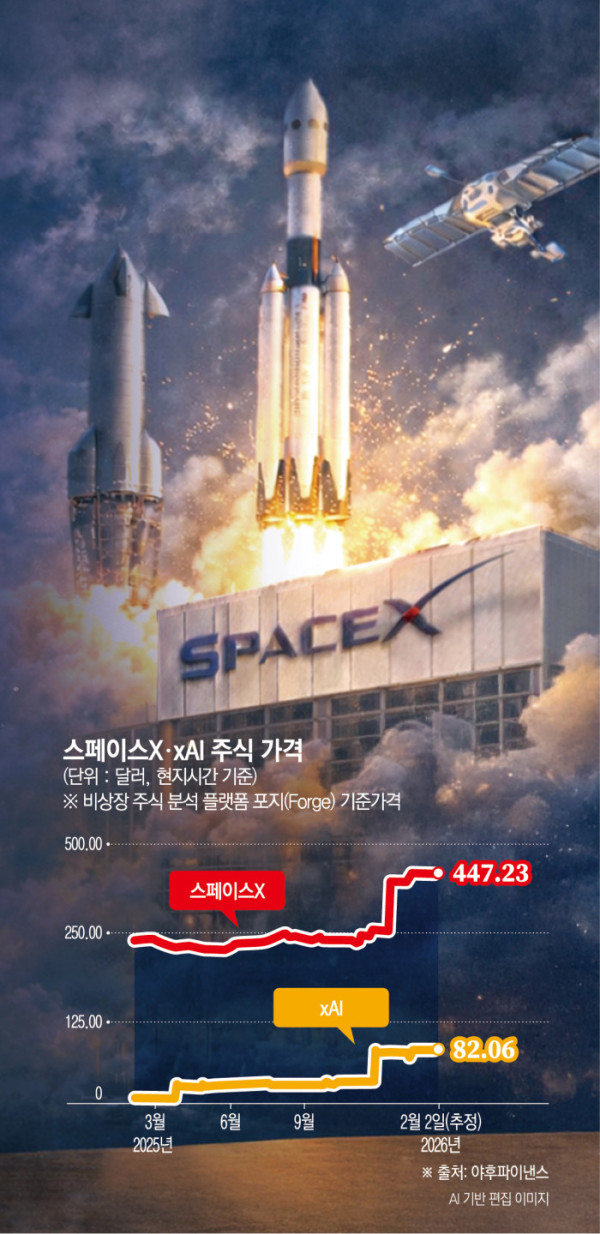 2일(현지시간) 블룸버그통신에 따르면 스페이스X는 xAI를 인수한다고 공식 발표했다. 이에 따라 xAI는 스페이스X의 완전 자회사로 편입된다. 이번 거래로 스페이스X와 xAI의 기업가치는 각각 1조달러, 2500억달러로 평가됐다. 통합 후 주식 가치는 주당 526.59달러가 될 전망이며 모든 거래는 주식 교환 방식으로 진행될 예정이라고 소식통은 귀띔했다. 연내 계획하는 스페이스X의 기업공개(IPO)도 추진할 것으로 알려졌다.