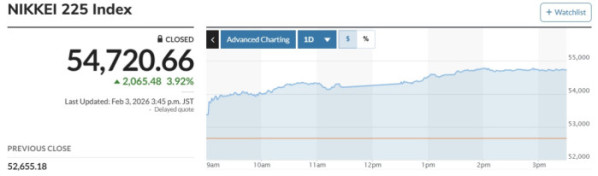이날 마켓워치에 따르면 일본 증시 대표 지수인 닛케이225지수(닛케이)는 전 거래일 대비 2065.48엔(3.92%) 상승한 5만4720.66으로 마감했다. 상승 출발한 토픽스는 마감까지 여세를 이어갔다. 종가는 전 거래일 대비 109.71포인트(3.10%) 오른 3645.84로 마감했다.