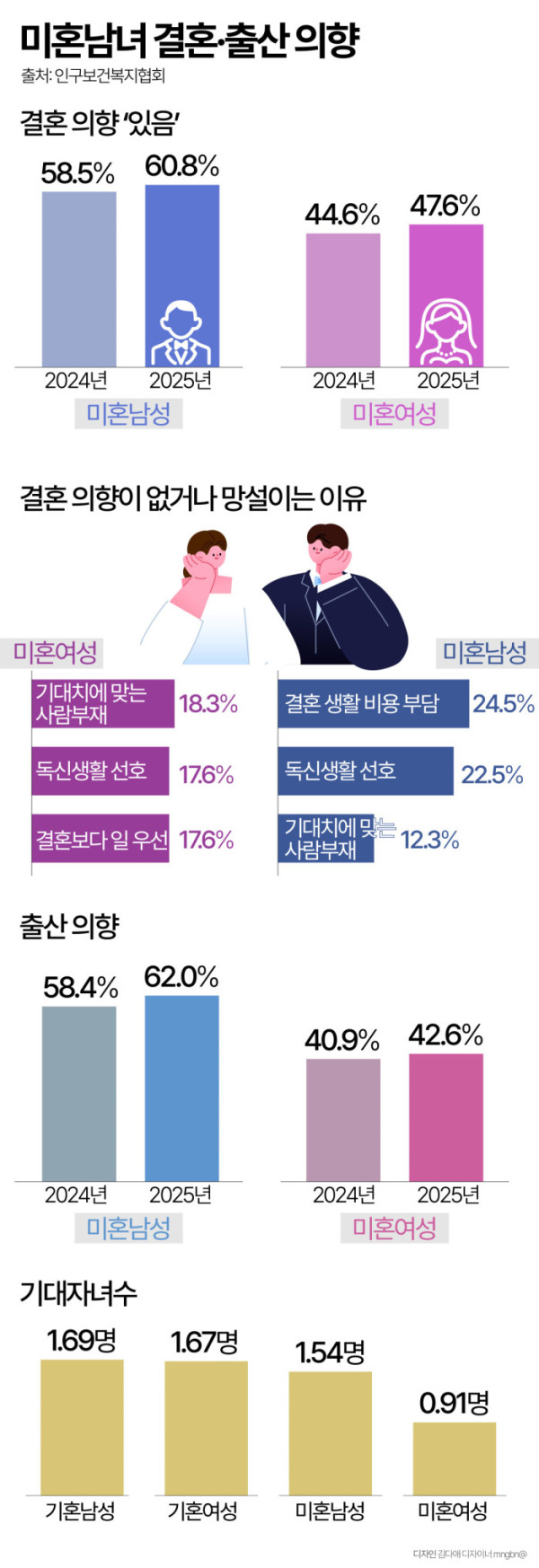 인구보건복지협회가 전국 만 20∼44세 남녀 2050명을 대상으로 지난해 9월 실시한 제3차 국민인구행태조사 결과 '결혼 의향이 있다'라고 답한 비율은 미혼 남성은 전년 58.5%에서 60.8%로, 미혼 여성은 44.6%에서 47.6%로 올랐다.