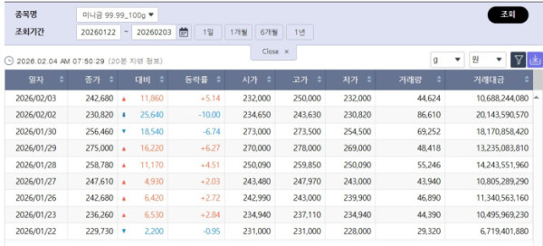 미니금 99.99%(100g) 역시 24만2680원으로 5.14% 급등했다. 장중 한때 25만원까지 오르며 변동성이 확대됐다.