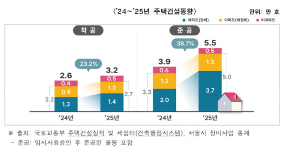 준공 물량도 늘었다. 2025년 준공 물량은 5만5000가구로 전년(3만9000가구) 대비 39.7% 증가했다. 이 중 5만가구(91.4%)가 아파트로 공급됐다.