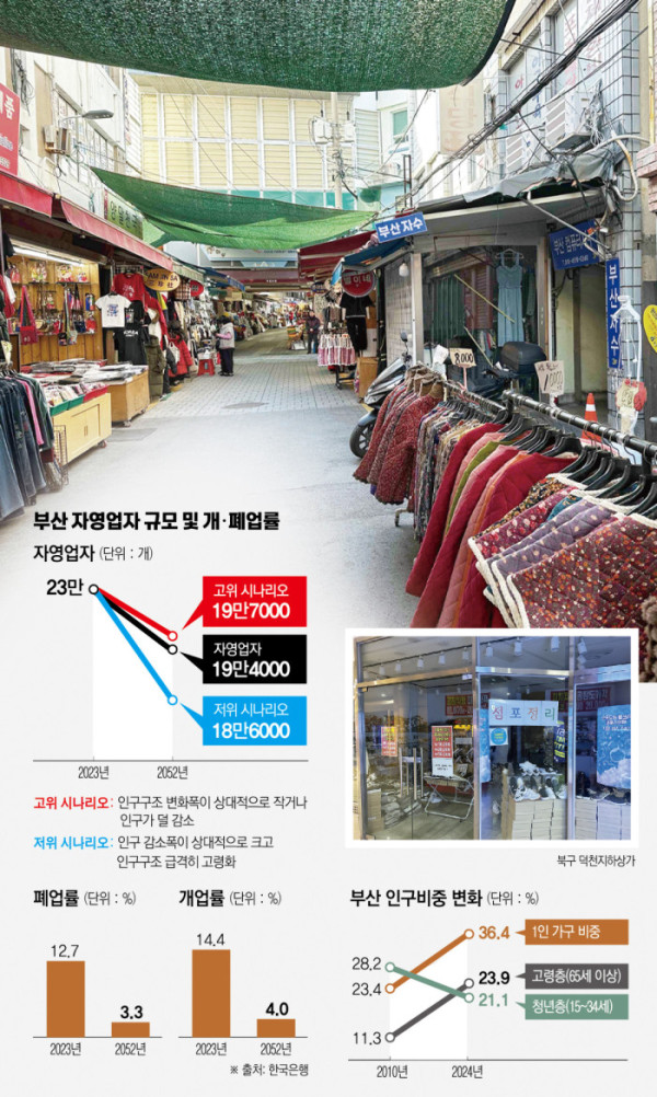 이러한 영향은 향후 전망에도 확인된다. 한은의 ‘향후 부산지역 자영업 규모 추정 시나리오 분석’을 보면 부산의 자영업 규모(개인사업체수)는 2023년 약 23만개에서 2052년 약 19만4000개로 15.4% 가량 감소할 것으로 예측됐다. 또 자영업자 개업률은 2023년 12.7%에서 2052년 3.3%로 줄고, 같은 기간 폐업률은 14.4%에서 4.0%로 감소할 것으로 예상됐다.