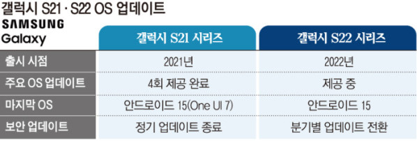 삼성전자 관계자는 “갤럭시 S21 시리즈가 출시된 2021년 당시에는 보안 패치를 5년간 지원한다고 공지했으며, 이에 따라 5년이 지난 2026년 1월이 마지막 정기 지원 기간이었다”고 말했다.