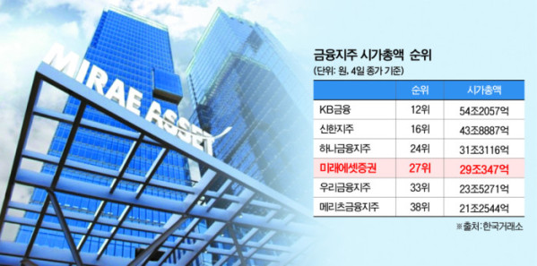 이제 시장의 관심은 미래에셋증권의 추가 상승 가능성에 쏠려 있다. 현재 미래에셋증권과 ‘시총 24위’ 하나금융지주(31조3116억원)의 격차는 2조2768억원까지 좁혀졌다. 최근 상승세를 고려하면 미래에셋증권이 조만간 하나금융지주마저 제칠 수 있다는 전망도 나온다.