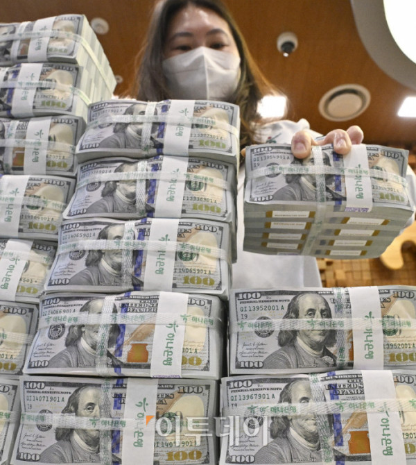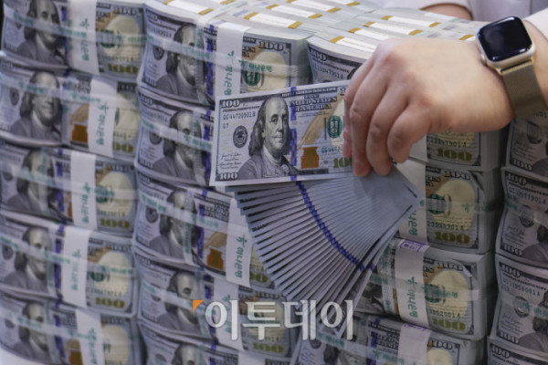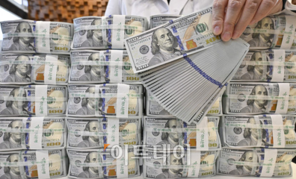 1월 외환보유액이 고환율에 대응한 외환시장 안정화 조치로 2개월 연속 감소했다. 4일 한국은행에 따르면 1월 말 기준 우리나라 외환보유액은 4259억1000만 달러로 전월보다 21억5000만 달러 감소했다. 지난해 12월 말(26억 달러)에 이어 두 달 연속 감소세다. 이날 서울 중구 하나은행 위변조대응센터에 관계자가 보유중인 달러를 정리하고 있다. 조현호 기자 hyunho@