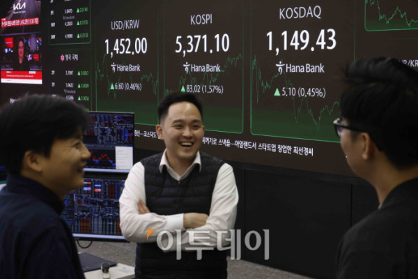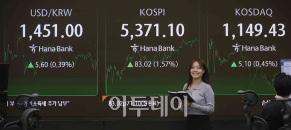 ▲코스피가 5300선을 돌파하며 사상 최고치를 경신한 4일 서울 중구 하나은행 딜링룸 전광판에 코스피, 코스닥, 원·달러 환율이 표시돼 있다. 이날 코스피 지수는 전 거래일보다 83.02(1.57%) 포인트 상승한 5371.10을 코스닥 지수는 5.10(0.45%) 포인트 상승한 1149.43을 나타내고 있다. 원·달러 환율은 종가 기준 1451.00원을 나타냈다. 조현호 기자 hyunho@