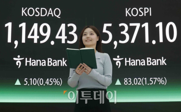 ▲코스피가 5300선을 돌파하며 사상 최고치를 경신한 4일 서울 중구 하나은행 딜링룸 전광판에 코스피, 코스닥이 표시돼 있다. 이날 코스피 지수는 전 거래일보다 83.02(1.57%) 포인트 상승한 5371.10을 코스닥 지수는 5.10(0.45%) 포인트 상승한 1149.43을 나타내고 있다. 조현호 기자 hyunho@