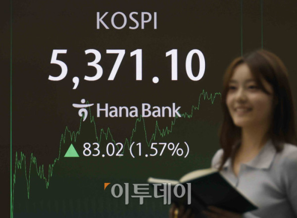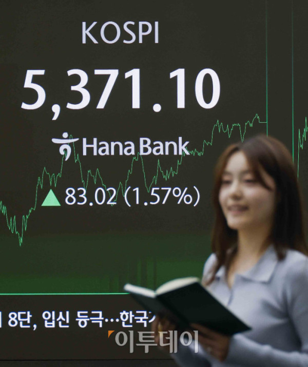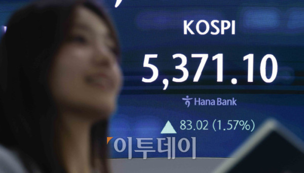 ▲코스피가 5300선을 돌파하며 사상 최고치를 경신한 4일 서울 중구 하나은행 딜링룸 전광판에 코스피가 표시돼 있다. 이날 코스피 지수는 전 거래일보다 83.02(1.57%) 포인트 상승한 5371.10을 나타내고 있다. 조현호 기자 hyunho@