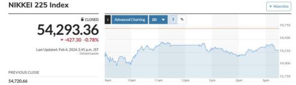 마켓워치에 따르면 일본 증시 대표 지수인 닛케이225지수(닛케이)는 전 거래일 대비 427.30포인트(0.78%) 내린 5만4293.36으로 마감했다. 급락 출발한 토픽스는 오후 들어 상승 전환했다. 종가는 전 거래일 대비 9.74포인트(0.27%) 오른 3655.58로 마감했다.