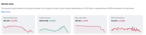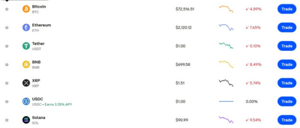 글로벌 가상자산 거래소 코인베이스에 따르면 한국시간 5일 오전 7시 기준 비트코인 가격은 7만2500달러 선에서 거래되며 전날 대비 약 4.9% 하락했다. 비트코인은 장중 한때 7만2000달러 초반까지 밀리며 2024년 11월 이후 최저 수준을 기록했다.