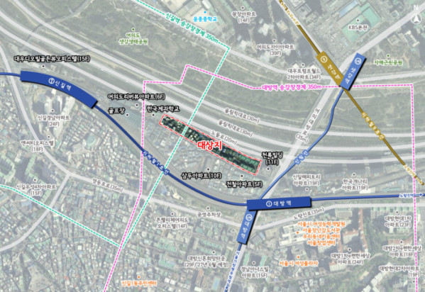 정비계획에 따라 공동주택 획지 1만2539㎡에 아파트 6개 동, 지하 4층~지상 최고 40층(120m 이하) 규모로 총 592가구가 들어선다. 이 중 장기전세주택 176가구와 재개발 의무임대 35가구가 포함된다. 교통·보행 환경 개선도 병행된다. 대상지 서측(8m)·동측(10m) 도로를 신설하고, 남측 여의대방로61길은 6m에서 10m로 확폭해 노들로와 여의대방로에서의 접근성을 높인다. 여의대방로61길 및 노들로변 보행공간을 조성하고, 대방역 인근과 한국제과학교 앞에 근린생활시설을 배치해 가로 활성화도 추진한다.