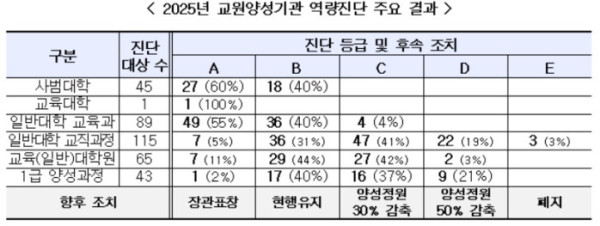 5일 교육부는 한국교육개발원과 함께 실시한 ‘2025년 교원양성기관 역량진단’ 최종 결과를 발표하고 진단 등급에 따라 2027학년도 교원양성정원을 감축·조정한다고 밝혔다. 진단 결과 D등급 기관은 교원양성정원의 50%가 감축되며, E등급 기관은 교원양성기능이 폐지된다.