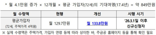 개선안의 핵심은 '덜 내고 더 받는' 것이다. 먼저 주택연금 수령액을 전반적으로 높인다. 평균 가입자인 72세·주택가격 4억원을 기준으로 계산하면 월 수령액이 기존 129만7000원에서 133만8000원으로 3.13% 오른다. 월 4만1000원 증가분을 평균 기대여명(17.4년)에 적용하면 가입 기간 전체에서 늘어나는 수령액은 약 849만원으로 추산된다.
