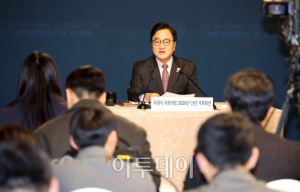 ▲우원식 국회의장이 5일 서울 여의도 국회 사랑재에서 신년 기자회견을 하고 있다. 고이란 기자 photoeran@