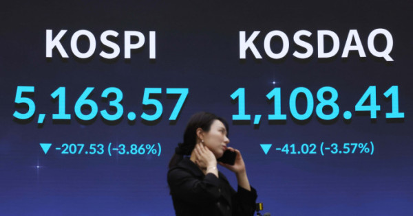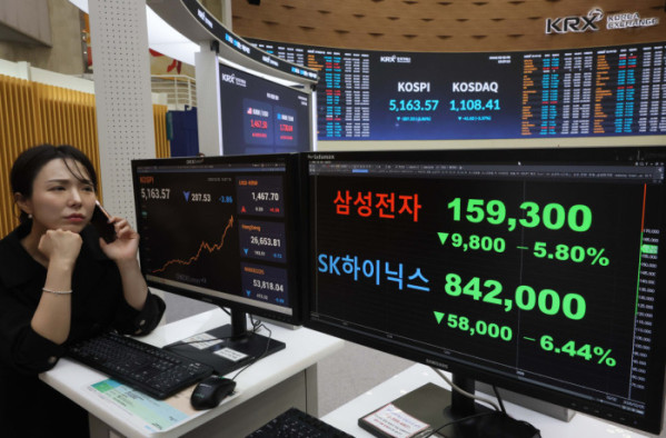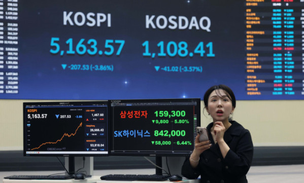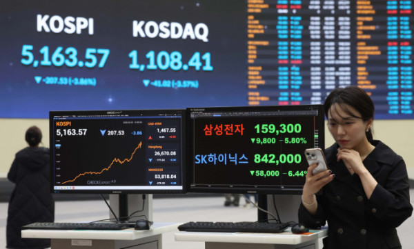 미국 증시에서 반도체와 인공지능(AI) 관련주가 급락한 여파로 국내 증시도 큰 폭의 조정을 받았다. 코스피는 하루 만에 200포인트 넘게 밀리며 5100선으로 내려앉았고, 코스닥 역시 1100선에서 약세 흐름을 이어갔다. 5일 서울 여의도 한국거래소 전광판에 코스피 등 시황이 표시되고 있다. 이날 코스피는 전 거래일(5371.10) 대비 3.86%(207.53포인트) 하락한 5163.57로 거래를 마쳤다. 이날 코스닥도 전 거래일(1149.43)보다 3.57%(41.02포인트) 내린 1108.41로 장을 마감했다.