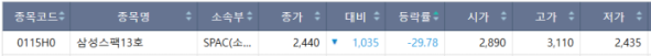 코스닥에서 하한가를 기록한 종목은 삼성스팩13호(2440원)다.