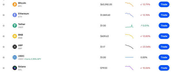 한국시간 6일 오전 6시 30분 기준 글로벌 거래소 코인베이스에 따르면 비트코인 가격은 24시간 전보다 13.79% 하락한 6만3592달러에 거래됐다. 이는 종가 기준으로 2024년 10월 말 이후 약 15개월 만의 최저 수준이다.