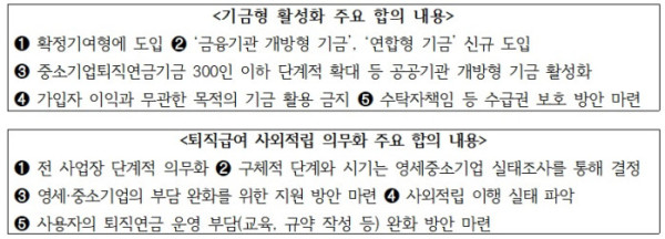 노·사·정이 모든 사업장의 퇴직급여 사외적립을 의무화하고, 기금형 퇴직연금을 활성화하기로 합의했다.