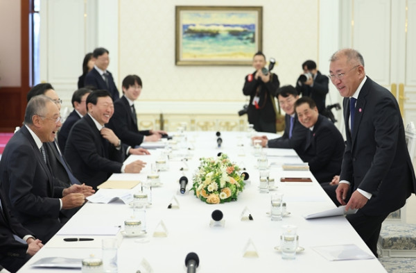 이재명 대통령은 4일 청와대에서 ‘청년 일자리와 지방투자 확대를 위한 기업간담회’를 주재했다. 이날 자리에는 이재용 삼성전자 회장, 최창원 SK 부회장, 정의선 현대차 회장, 구광모 LG 회장, 신동빈 롯데 회장 등 재계 서열 상위 그룹 총수들이 총출동했다.