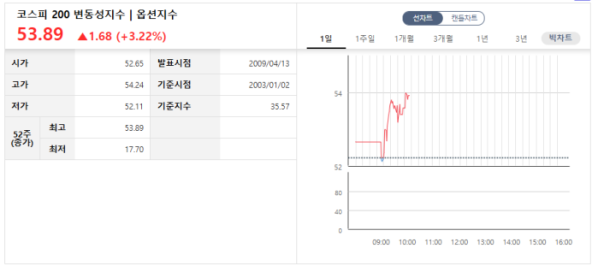 VKOSPI는 옵션 가격에 반영된 향후 시장의 기대 변동성을 측정하는 지수로 보통 코스피가 급락할 때 오르는 특성이 있다.