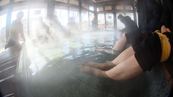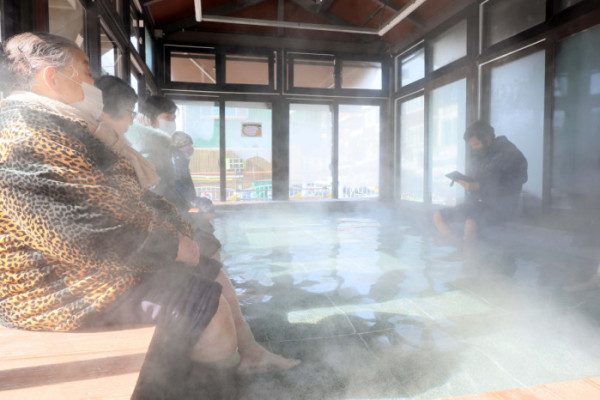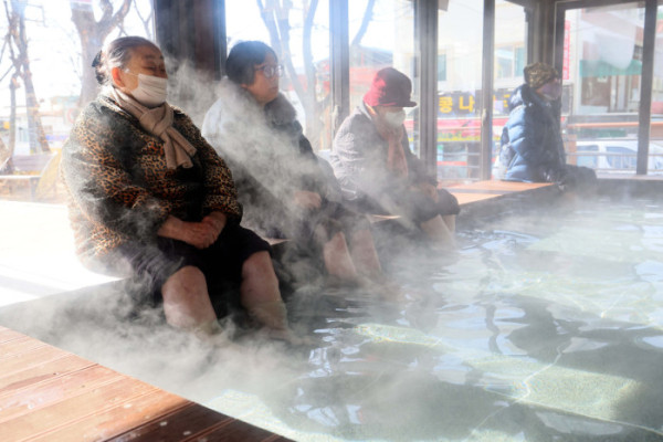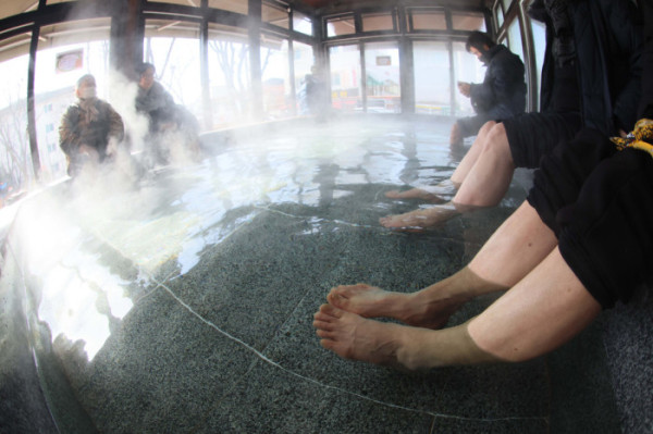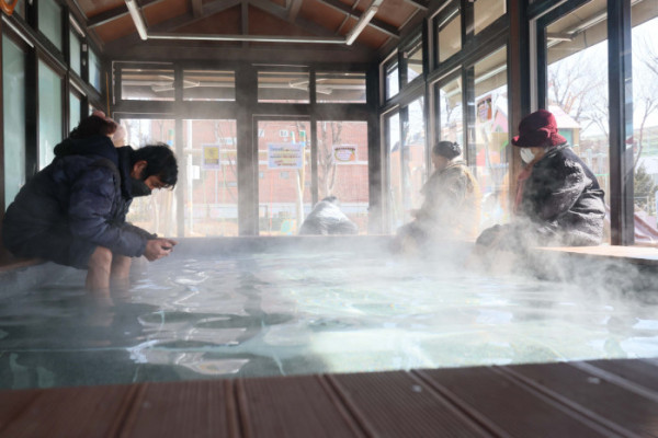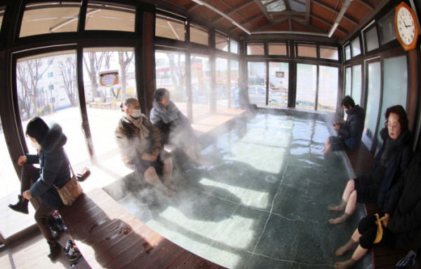 기온이 큰 폭으로 떨어지면서 서울을 비롯한 중부 곳곳에 한파주의보가 내린 6일 경기 시흥시 소래어린이공원족욕장에서 시민들이 족욕을 하며 추위를 녹이고 있다.