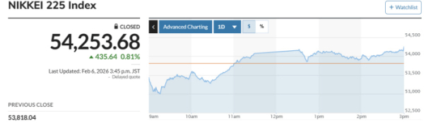 일본 증시 닛케이225지수는 전장보다 435.64포인트(0.81%) 오른 5만4253.68에, 토픽스지수는 전일 대비 46.59포인트(1.28%) 뛴 3699.00에 각각 거래를 마쳤다.