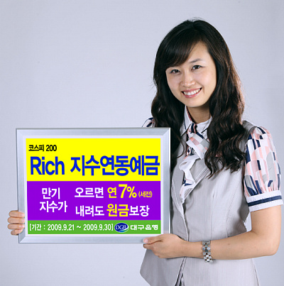 대구은행 관계자는 “만기에 주가지수가 떨어지더라도 원금이 보장되고 만기 시 주가지수가 상승 하기만 하면 일반정기예금 보다 높은 금리를 받을 수 있어, 안정성과 수익성을 동시에 추구하는 고객에게 적당한 상품”이라고 말했다.