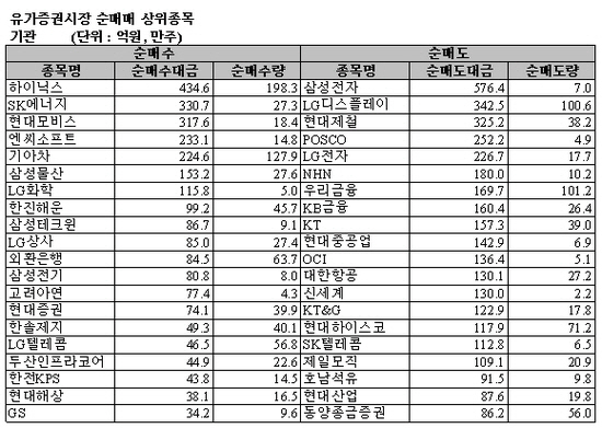 반면 삼성전자(-576억원)를 가장 많이 팔았으며 LG디스플레이(-342억원), 현대제철(-325억원), POSCO(-252억원), LG전자(-226억원), NHN(-180억원), 우리금융(-169억원), KB금융(-160억원) 등을 순매도했다.
