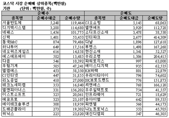 코스닥시장에서는 서울반도체(52억원)를 가장 많이 순매수했고 디지텍시스템(32억원), 네패스(14억원), 신텍(14억원), 동국S&C(8억원) 등을 사들였다.