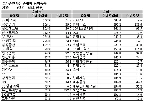 종목별로는 전일에 이어 SK에너지(658억원)를 가장 많이 사들였고 삼성전기(306억원), 삼성테크윈(305억원), 현대모비스(252억원), LG전자(235억원), SK케미칼(226억원), 삼성물산(129억원), LG화학(98억원) 등을 순매수했다.