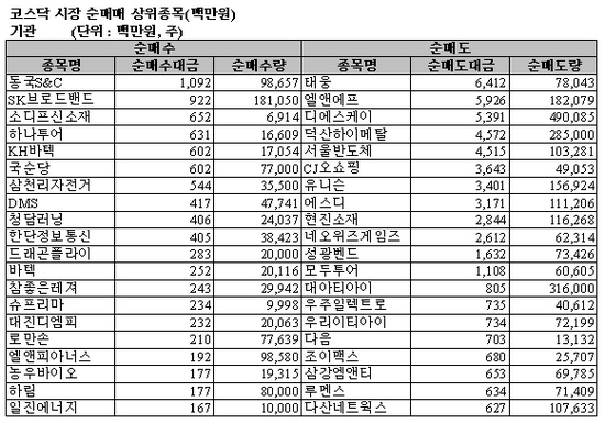 코스닥시장에서는 동국S&C(10억원)를 가장 많이 순매수했고 SK브로드밴드(9억원), 소디프신소재(6억원), 하나투어(6억원), KH바텍(6억원) 등을 사들였다.
