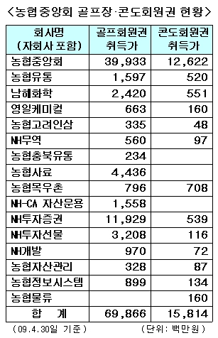 농협중앙회·농협 자회사 골프·콘도 회원권 857억원 상당 보유