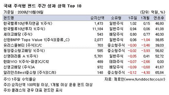 중소형주가 상대적으로 선전하면서 중소형주 투자비중이 높은 펀드들이 주간성과 상위권을 차지했다. 하락장에서 지수 방어능력이 우수한 배당주식펀드도 상대적으로 선방하는 모습을 보였다.